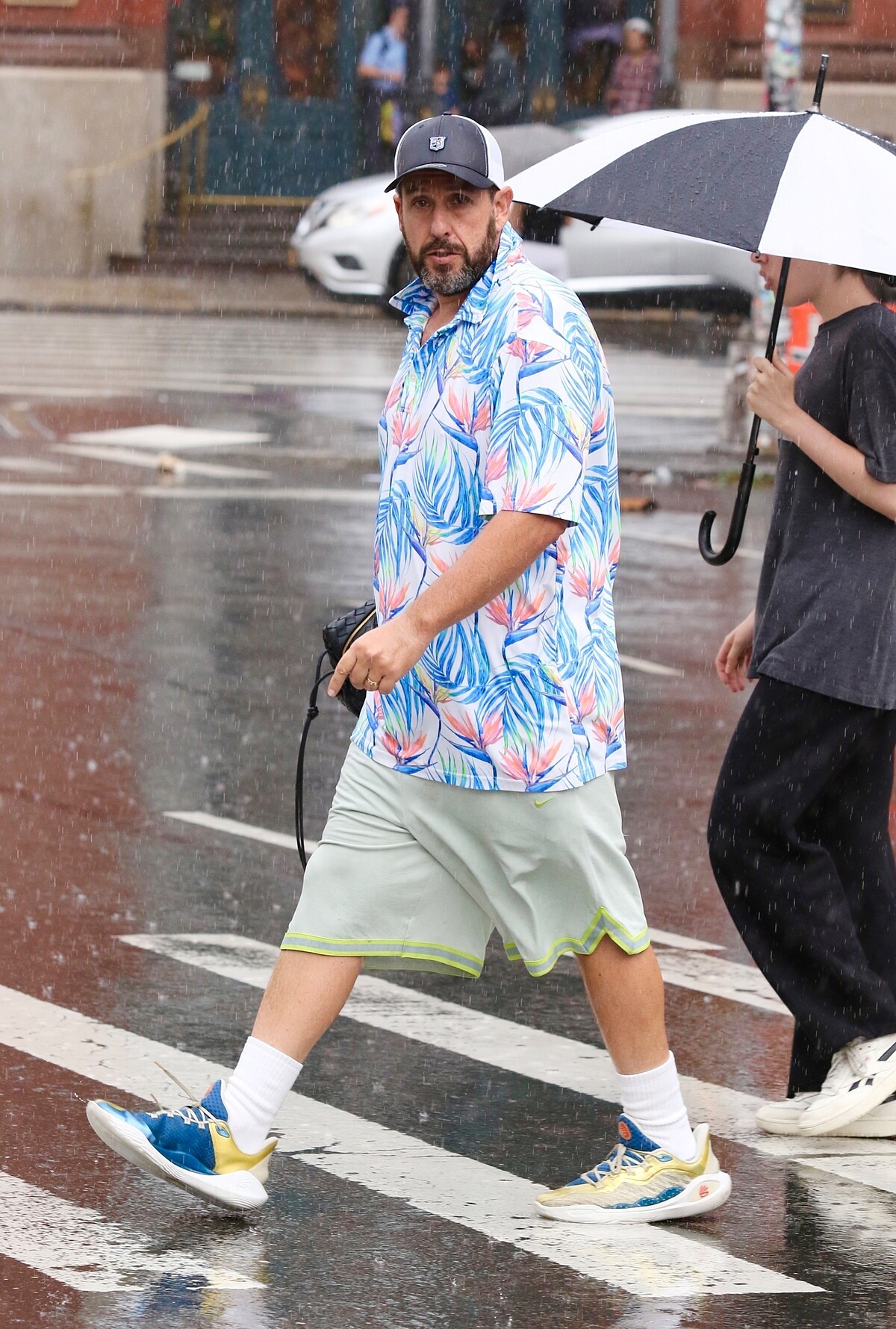 而在奧斯卡典禮上亞當山德勒選擇一件淺藍色連帽外套,下半身則穿著Adidas藍白拼接籃球短褲,腳上則是Under Armour Curry11今年所推出的新配色「Championship Mindset」系列,整體造型充滿街頭與運動元素,與奧斯卡典禮的正式服裝形成強烈對比!然而,也不能說他是刻意想成為焦點,因為亞當山德勒平常真的就是這麼穿,這件外套甚至已多次出現在他的日常。