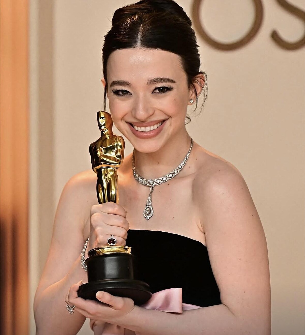 榮獲最佳女主角獎的年輕新科影后麥琪麥迪遜MikeyMadison,以公主般的甜美裝扮出席。Tiffany & Co.超過百年歷史的大鍊墜骨董項鍊成為整身焦點,柔美線條與身上的粉色禮服以及腰間蝴蝶結相呼應,再用鑽石耳環、手環完整造型,完美襯托青春氣質。