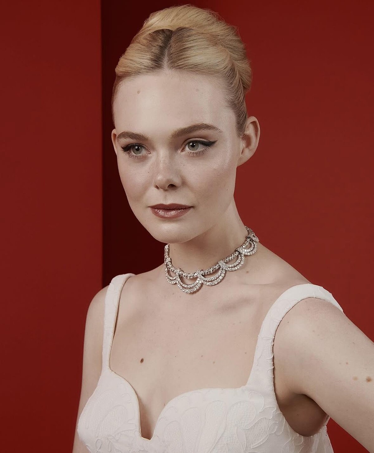 踏上奧斯卡紅毯的艾兒芬妮Elle Fanning,選擇了Cartier的鑽石項鍊增添典雅造型感。如蕾絲般的圓弧造型項鍊,與白色Givenchy 訂製禮服的甜美感十分契合。