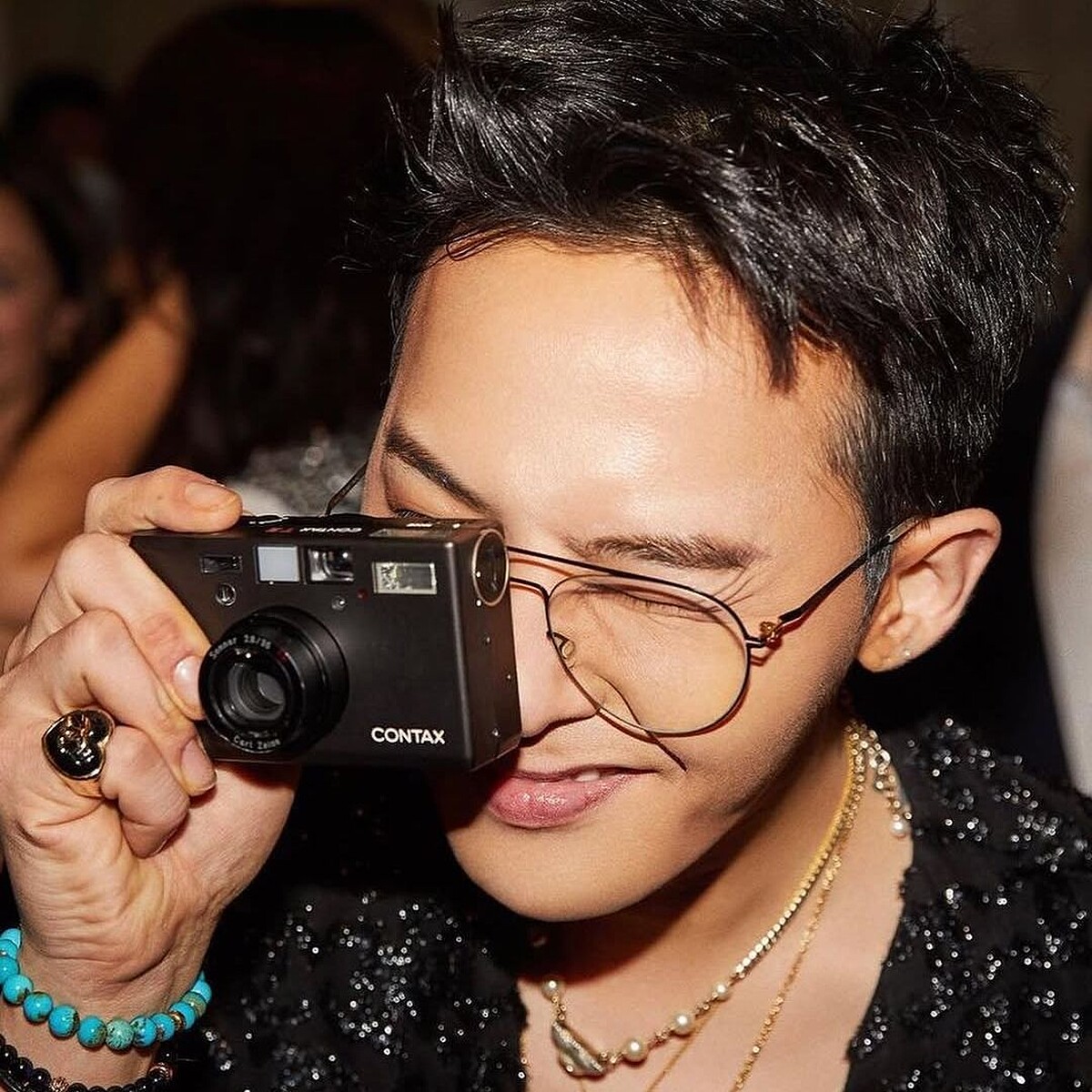 GD 選擇此副眼鏡作為他的作品造型焦點,簡潔俐落的設計符合時下簡約趨勢,鏡框輪廓也帶來摩登不造作的現代感,G-Dragon 絕佳的搭配美感,讓許多經典單品混搭出屬於他自己的個人樣貌,跳脫框架,不斷突破自我,完美展現人穿衣不是衣穿人的造型哲學。喜愛攝影的 GD 也時常將手邊攜帶的底片機拿出拍攝,他手中的 CONTAX 底片機也成為時下潮人們的入手清單之一。