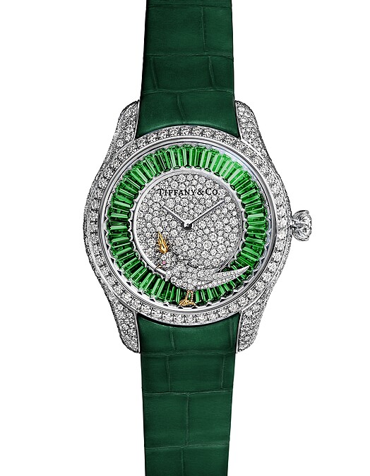 Tiffany & Co.蒂芙尼剛於2025 LVMH Watch Week 亮相的「石上鳥」沙弗萊石腕錶,全球獨家只於臺北101旗艦店限量販售。外型設計最大亮點是鑲鑽小鳥點綴錶盤外圈,可隨著穿戴者的動作自由旋轉,更顯韻律靈動。
