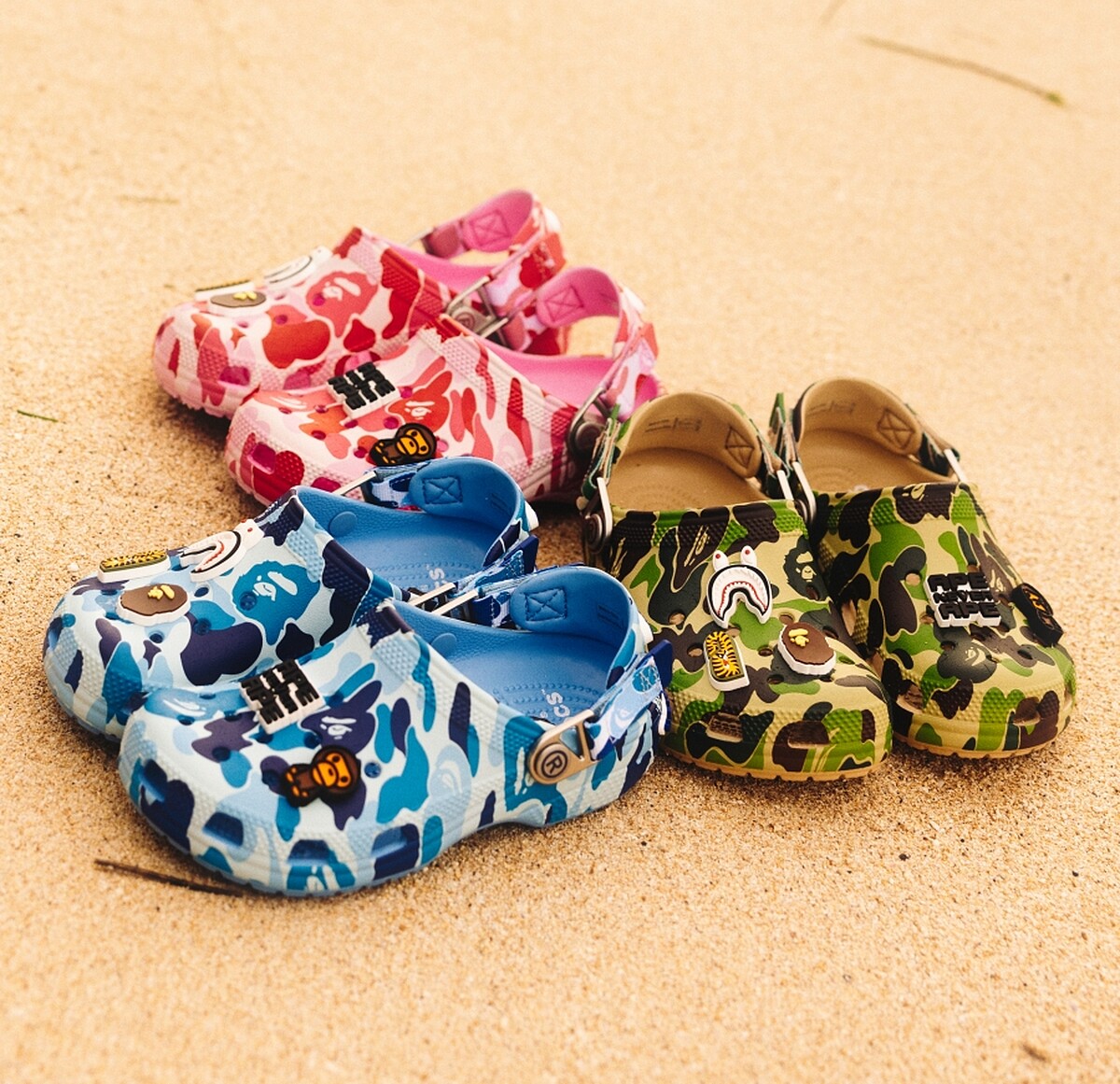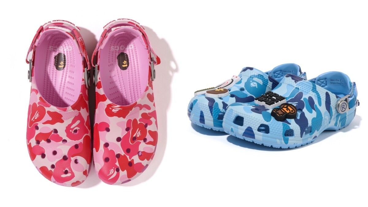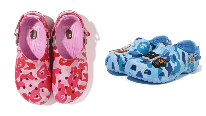 A BATHING APE®曝光了與Crocs的首次合作系列,以經典的Classic Clog鞋型為基礎,結合標誌性的Abc Camo猿人迷彩圖樣,推出藍色、綠色和粉紅色三款色系,每雙鞋款都搭配有猿人頭像、Baby Milo等專屬聯名Jibbitz™鞋釘裝飾。