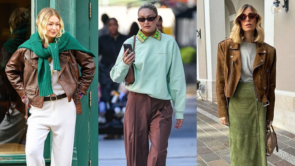 相較起鵝黃、寶寶藍比較需要多一點搭配技巧的可能會是這個棕色+抹茶綠的組合,這樣的色系搭配可以參考一向對於色彩組合都蠻大膽的超模Gigi Hadid的私服造型,除了可以將綠色單品運用作為披肩之外,還可以透過上下身撞色的組合呈現!