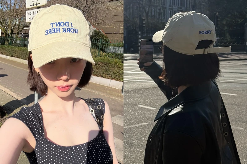 另一頂在荷蘭阿姆斯特丹旅遊時戴的「I DON’T WORK HERE.」刺繡字樣帽款則是來自倫敦獨立時尚與出版品牌IDEA所都出的品牌周邊商品,帽款背後也搭配上「SORRY.」刺繡文字,展現時尚的幽默感,售價為40英鎊(約1,713台幣),不過Karina的同款卡色系目前在官網上已銷售一空,其他還有綠色、深藍以及鐵灰可以選擇。