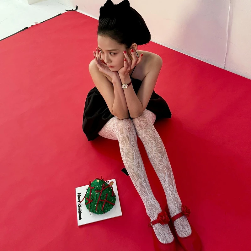 甜美公主風一直是Jisoo擅長的風格,把握「黑+白+紅」不超過三個顏色的基本公式,就能將紅色穿出甜美風,不管是黑色的小洋裝,或是純慾感的白色蕾絲褲襪,都是近年很值得嘗試看看的流行性單品。