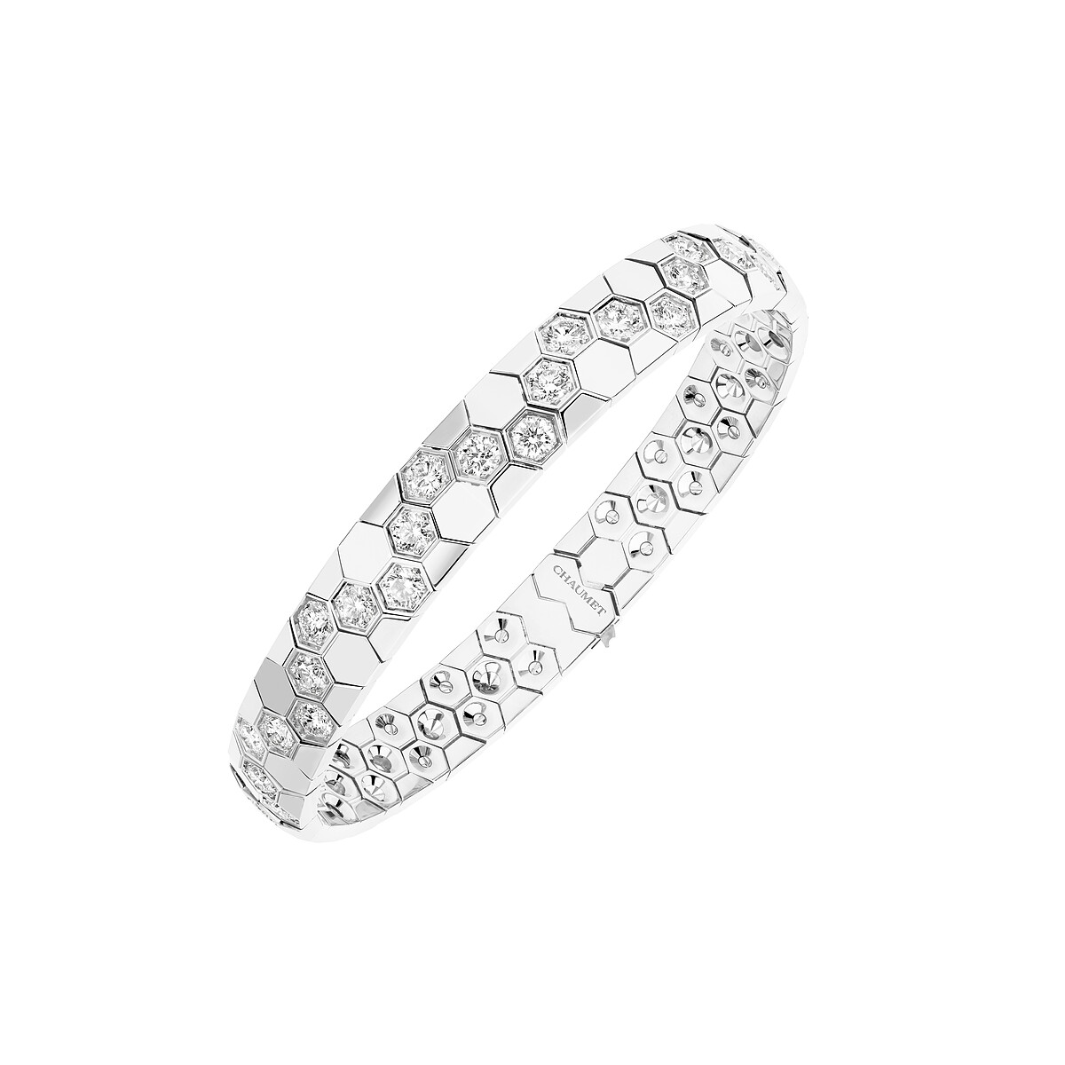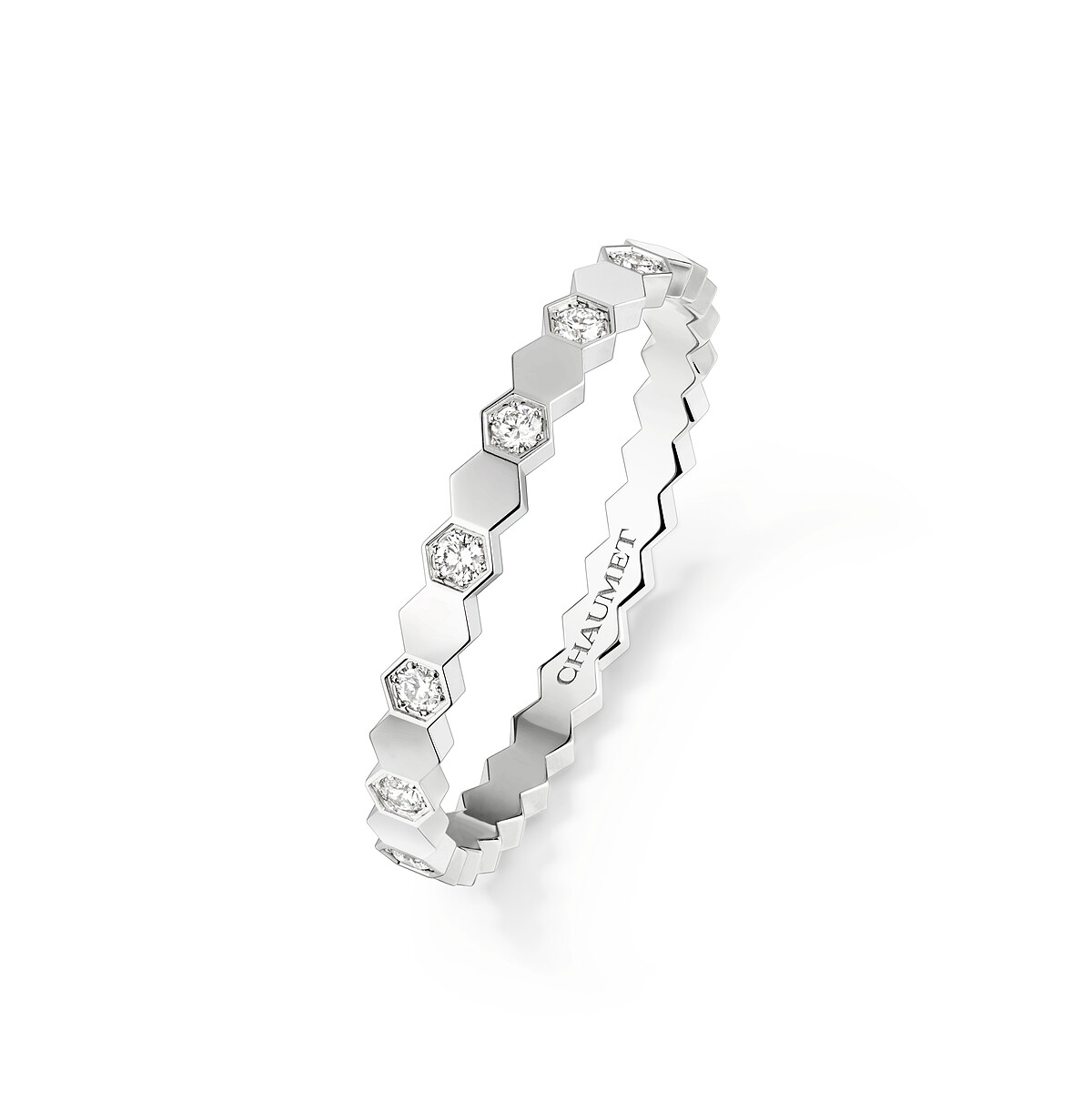 Chaumet從過去至今都能於珠寶上見到蜜蜂的設計,現代珠寶則以2011年推出的Bee de Chaumet(現更名:Bee de Chaumet)為重要系列,除了沿用蜜蜂的可愛模樣,也從蜂巢汲取六角形設計主題靈感,幾何摩登的模樣,也符合不拘泥性別的日常穿搭,混搭的概念。細節部分,金屬拋光也十分講究,運用「鏡面拋光」令六角形金質散發如蜜光彩。或是,將一排排「金屬蜂巢」鉸接一體,創造靈動柔軟能貼合身體曲線的作品。