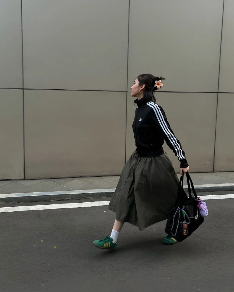 長裙是許多女孩衣櫃中的常駐單品,輕鬆一搭就能呈現出隨性時髦感,但多了一些溫柔的感覺。配上同樣百搭又輕盈的德訓鞋,能夠避免下半身的份量感過於強烈,又能展現出一種漫不經心的態度。