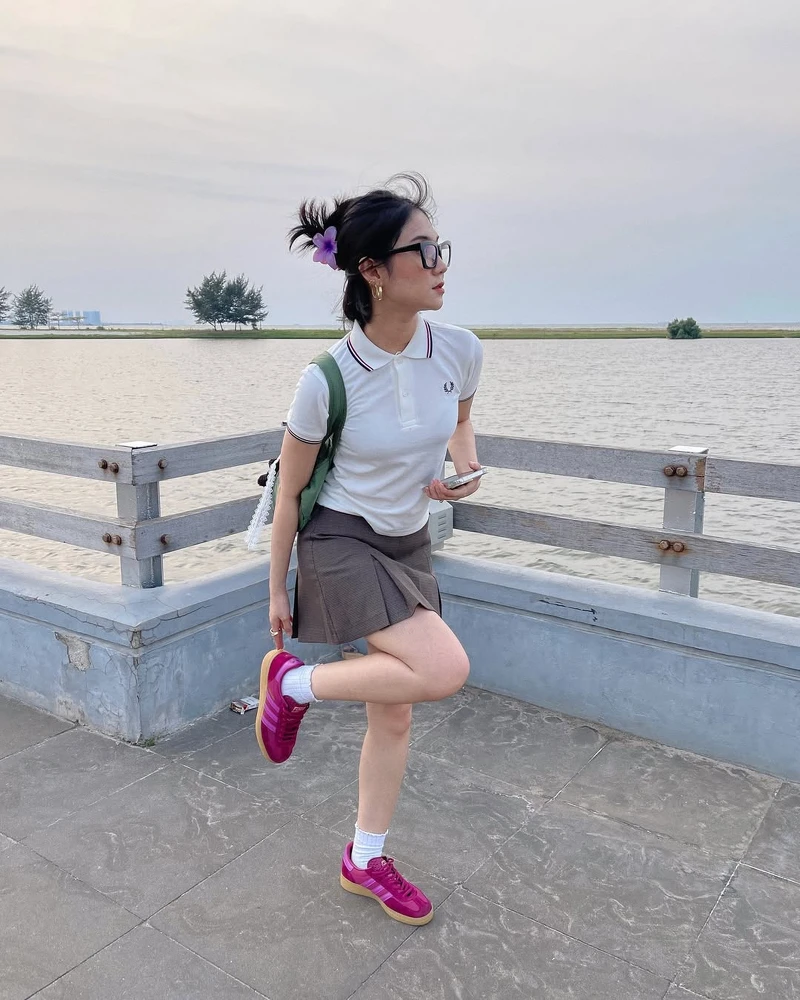百摺短裙學院感又輕盈,活潑的感覺與德訓鞋做搭配會帶有隨性的街頭風格。只在都市遊走的話,有了德訓鞋的幫助,能夠提供舒適、好走的機能性,也可以中和整體造型的風格,展現出充滿都會卻又十分愜意的時髦感。