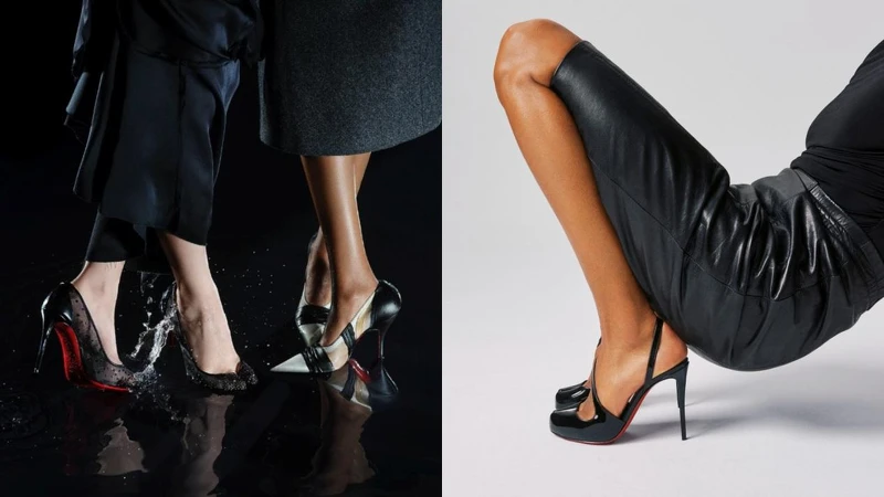Martinloula 高跟鞋採用黑色小羊皮,運用 Décortiqué 技術與手工磨損效果,融合不同質感,展現獨特的前衛美學,尖頭設計與深V鞋口相得益彰。創新塗層技術帶來全新「Everlasting Red Sole」,確保紅底持久鮮艷與耐用,延續 Louboutin 經典魅力並增添價值。