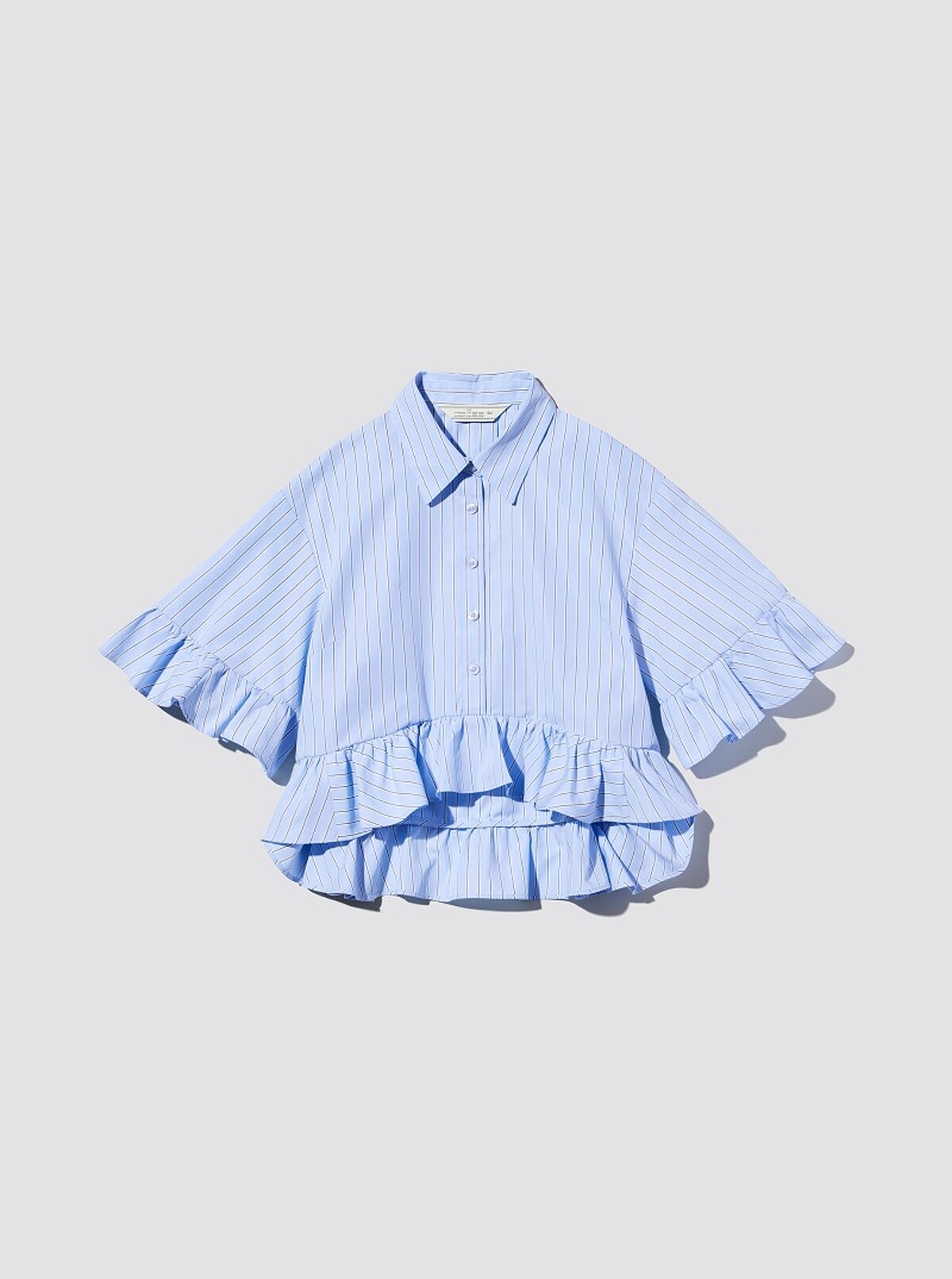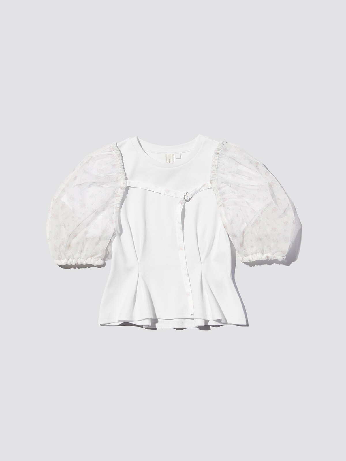 非常有rokh風格的解構式上衣,將薄紗澎袖與T恤結合的設計,無論單穿或套裝組合都可以。