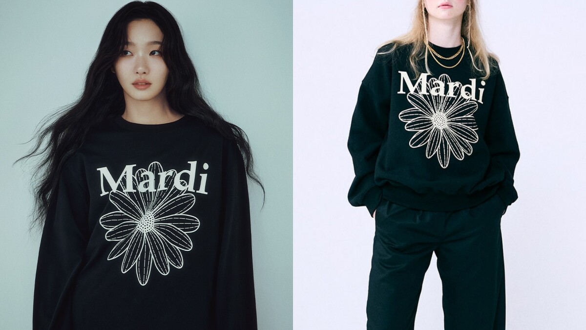擁有一張高級臉的金高銀總是能把潮流品牌穿出高奢感, Mardi Mercredi經典的小雛菊大學T可以說是喜愛韓系穿搭人手一件的單品,從簡單的黑白配色再到鮮豔繽紛的春天撞色款都有,但想要穿出與眾不同的感覺,下身不妨可以大膽嘗試特殊材質的單品如半透視的蕾絲裙,或是及膝半身裙配上高筒鞋,更能顯得比例修長。