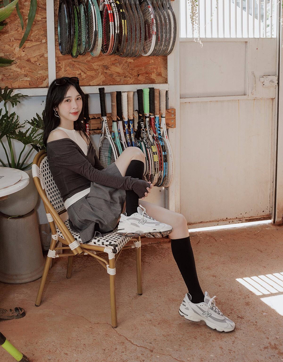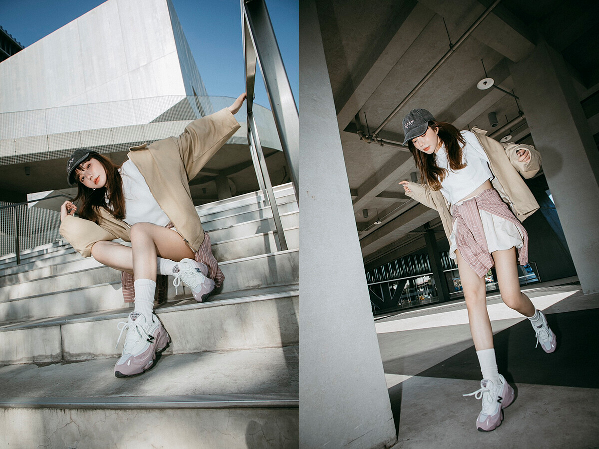 「Sporty Chic」意旨「時髦運動風」,既要舒適實用,又要展現個人風采。曾玄玄以黑白相間的層次上衣搭配百褶短裙,腳踩奶白色1000,黑白相間的鞋身與上衣相互呼應,巧妙提升造型層次感與風格!誰說仙女不能耍酷,這樣搭輕鬆跟上「Sporty Chic」