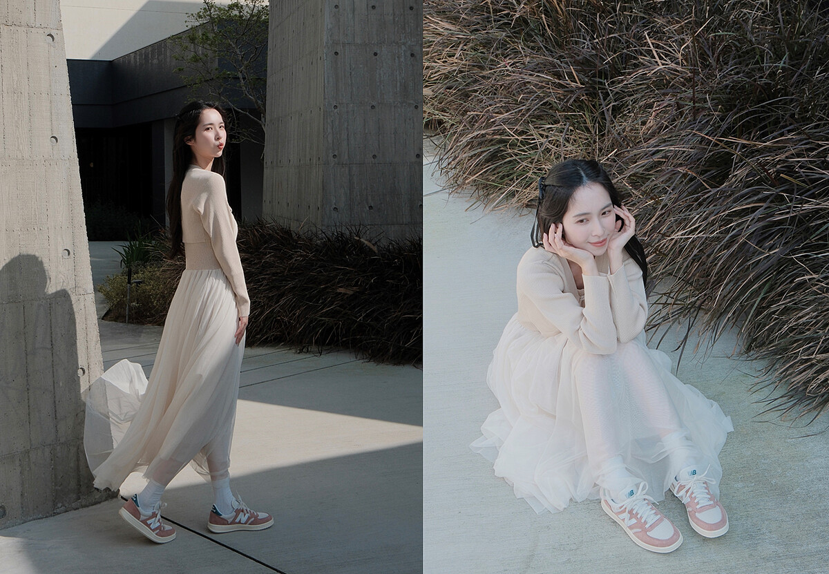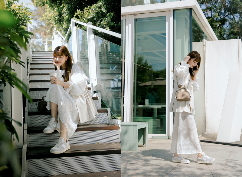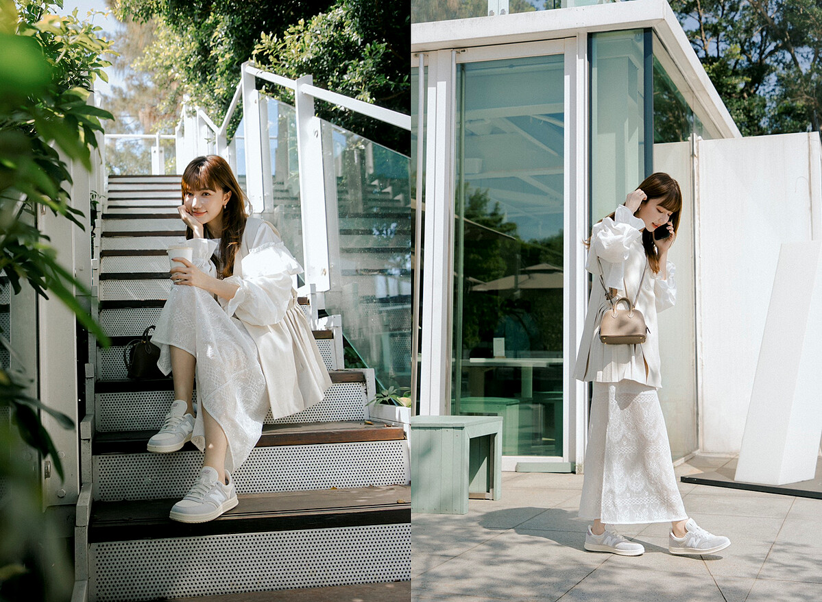 另一組穿搭中,謝琦琦以全白單品為基底,疊搭杏色西裝背心,營造清新透亮的日系雜誌感。腳上的T500更是讓編輯們少女心爆棚,平底板鞋設計搭配自問世來就倍受矚目。在配色上則以淡紫色鞋面與搭配奶油色鞋底,在乾淨簡約的風格中添加一絲精緻溫柔,不論任何風格都能輕鬆駕馭,女孩們一定要收入鞋櫃!