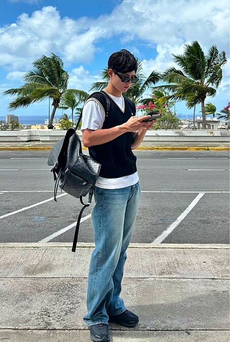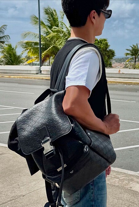 朴寶劍一身學院風的上身造型搭配寬鬆丹寧褲,清新自然的質男印象深得人心,而他上肩的後背包是來自 CELINE 的 TRIOMPHE 雙肩後背包。