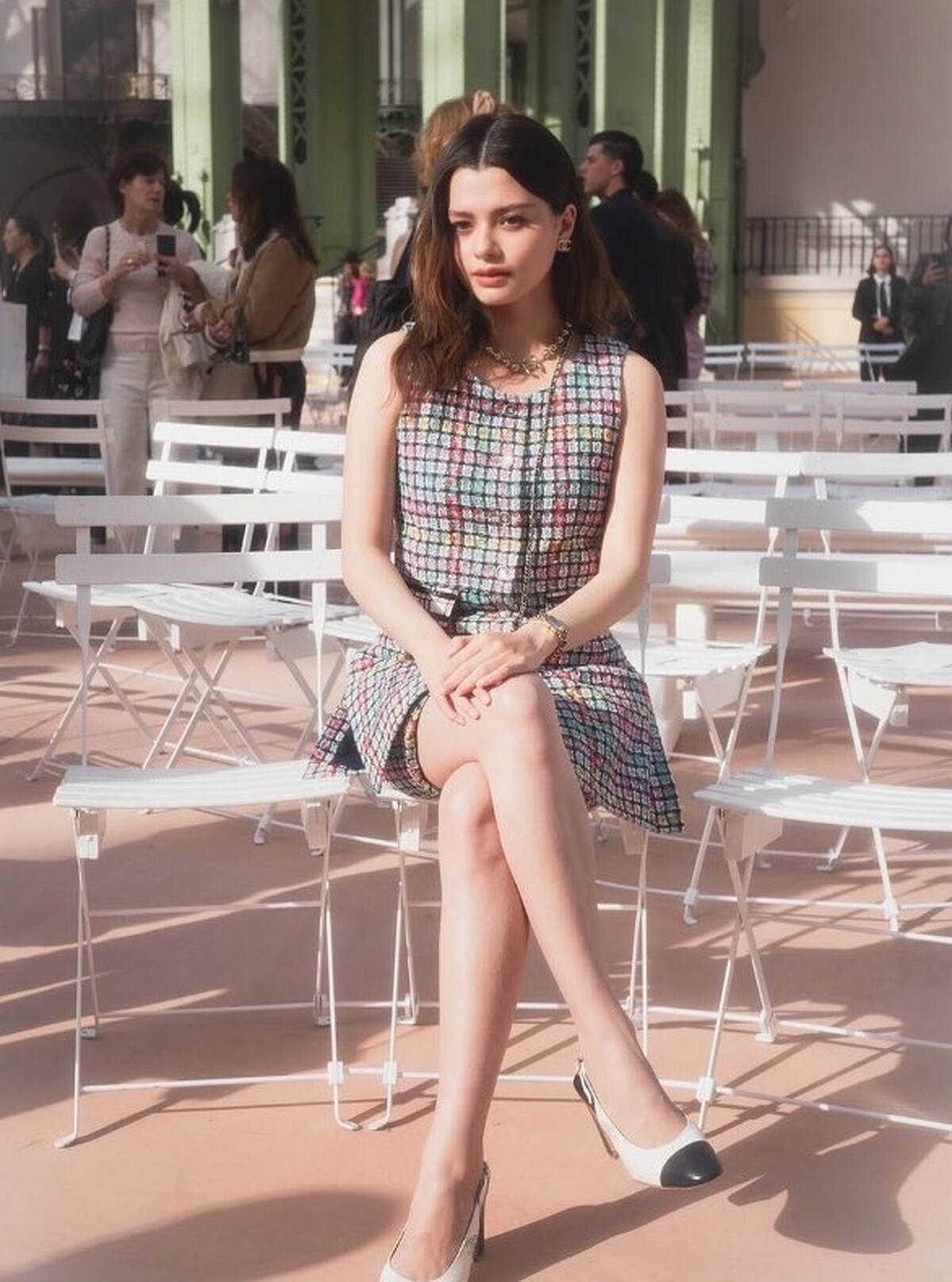 坐在巴黎香奈兒秀場前排的Becky,以一套斜紋軟呢的彩色編織背心洋裝現身,他將經典的法式名媛風演繹得恰到好處。色彩斑斕但分布精緻,搭配珍珠項鍊與雙色鞋,從細節中流露高雅氛圍。這是屬於「低調卻奢華」的背心造型,適合參加正式活動、品牌場合,或展現自己高級審美的時刻。
