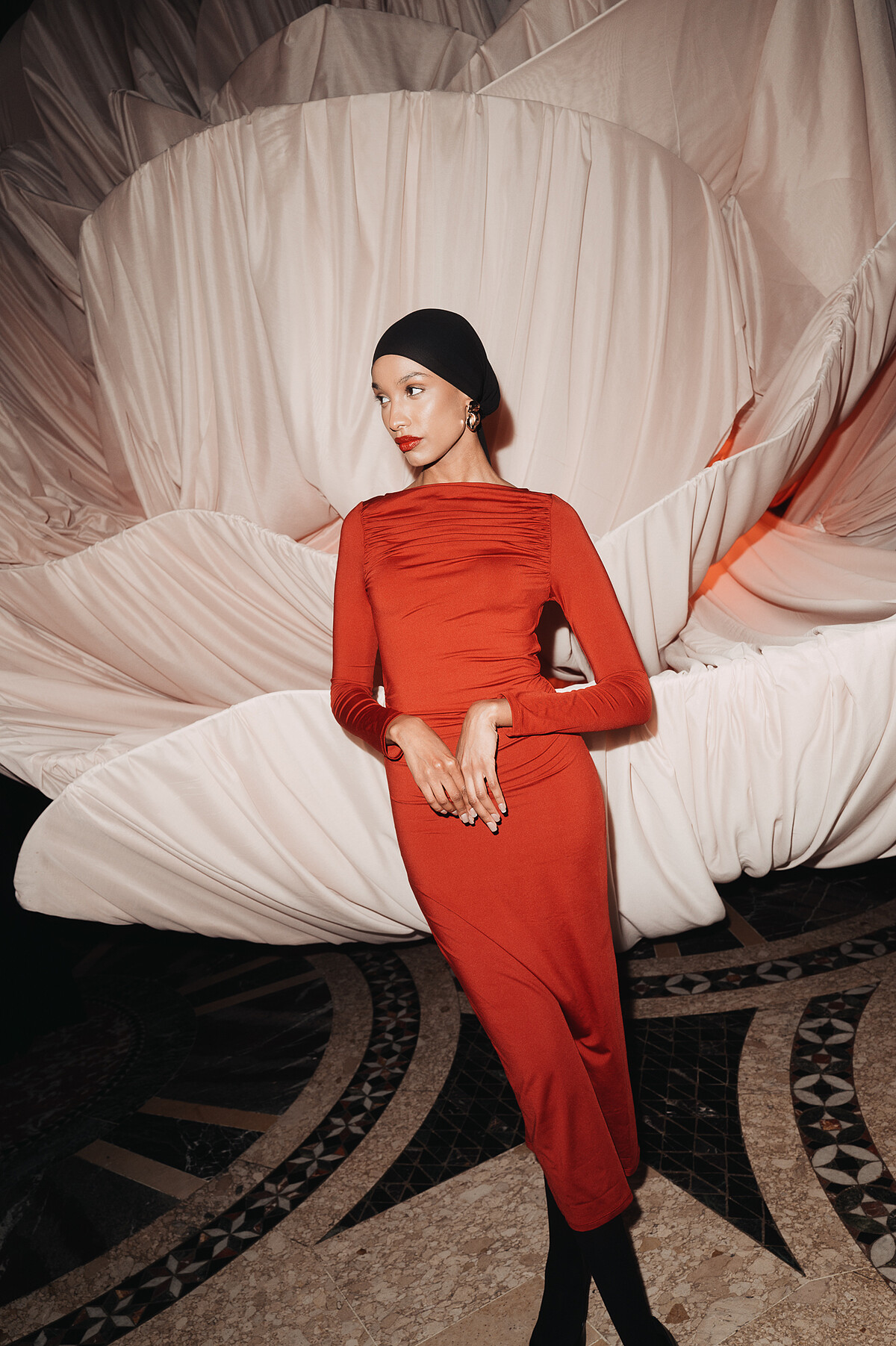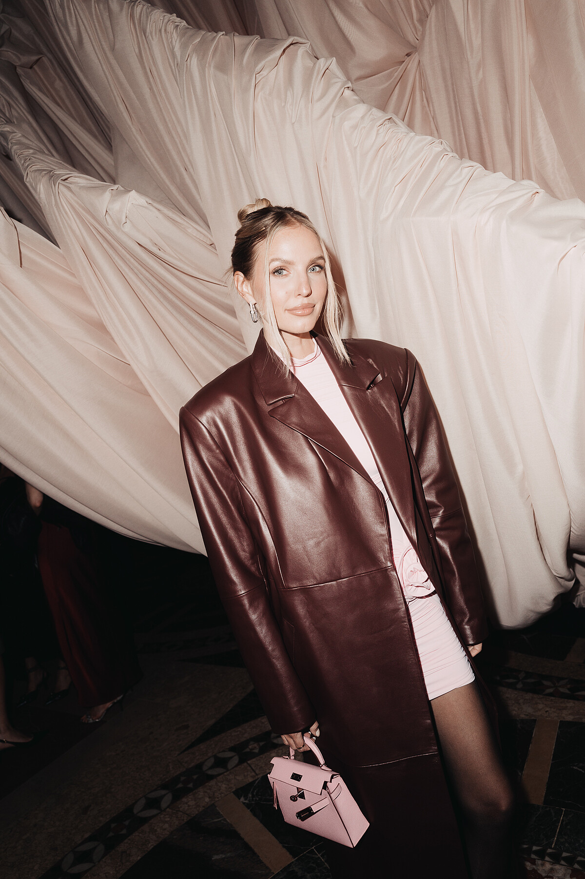 為致敬「玫瑰」這一貫穿Magda Butrym創作脈絡的標誌性設計語彙,整座場館被打造成一處充滿魔幻、粉紅泡泡的秘境。一座巨型玫瑰藝術裝置從地面綻放而出,仿佛是建築本身生長出的夢境,柔和的粉色燈光從穹頂灑落,與老建築的金屬與大理石紋理交織出一場視覺與情感的對話。