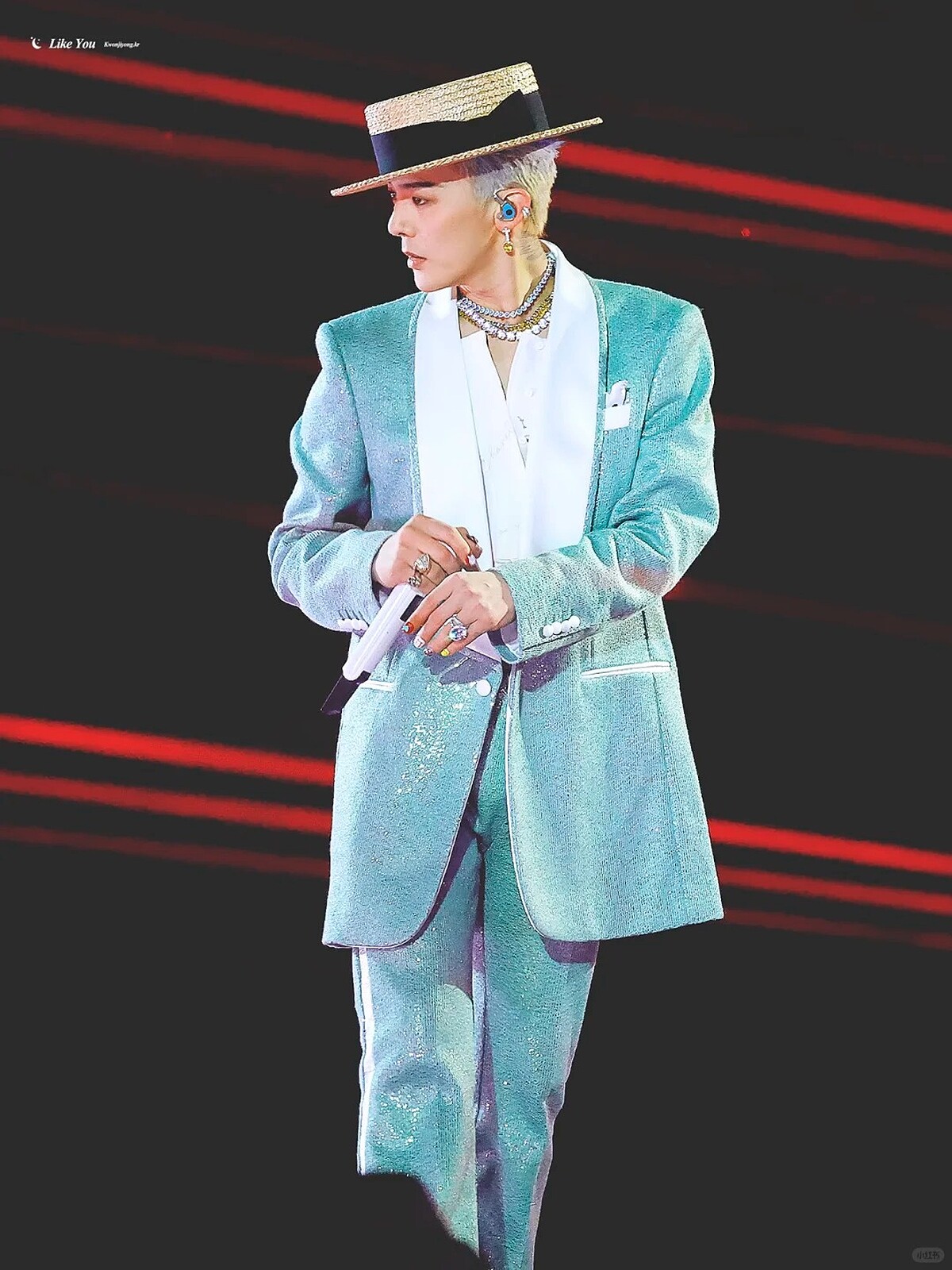 如前言所述,GD 權志龍每次亮相的造型都成為時尚圈討論話題,更有人說 G-Dragon 不追隨時尚,是時尚追隨 G-Dragon,而龍哥近期在個人演唱會《G-Dragon Übermensch》中驚艷登場的造型更穿上AMIRI 2025春夏系列的 Look 46,一身極具質感的藍綠色紳士造型,搭配平頂紳士帽,在經典復古與現代輪廓中巧妙取得平衡!