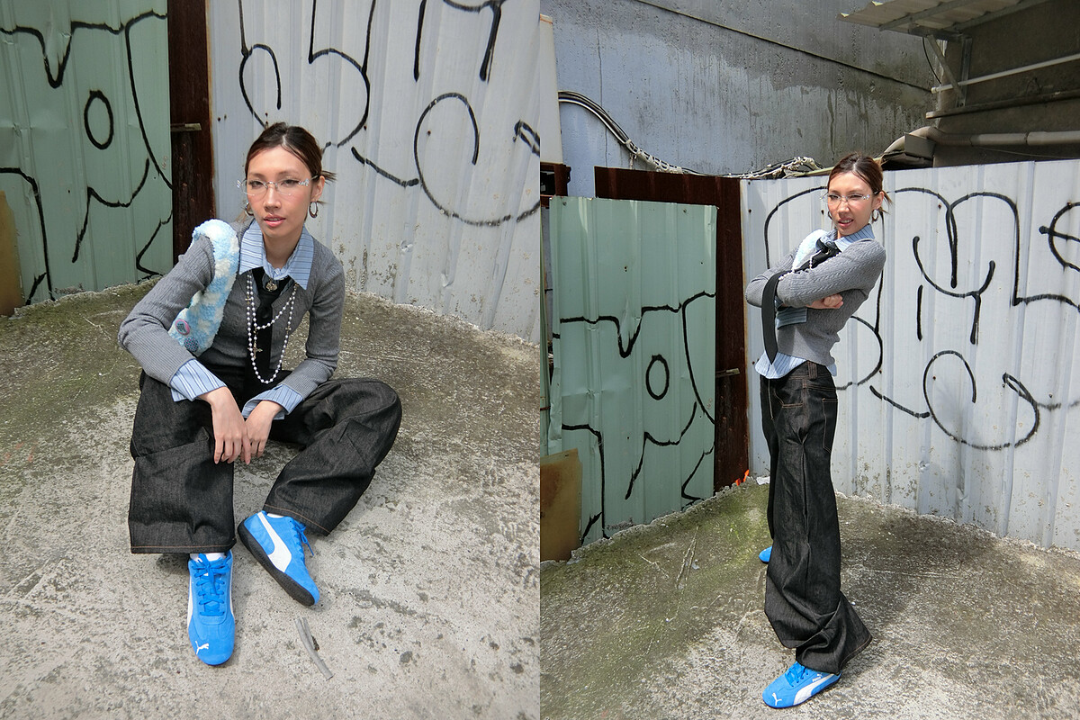 即使是繁複大膽的前衛混搭造型,PUMA Speedcat也能毫不突兀的融於其中,Karencici以襯衫、針織衫、西裝寬褲加上項鍊、領帶與毛毛背包的多樣性混搭方式,瞬間讓乖巧氣質學院風格添加叛逆指數,踩上PUMA Speedcat系列全新藍色鞋款,呈現更跳脫更亮眼的矚目度,證明想酷炫炸街不能少了這雙寶物來助力!