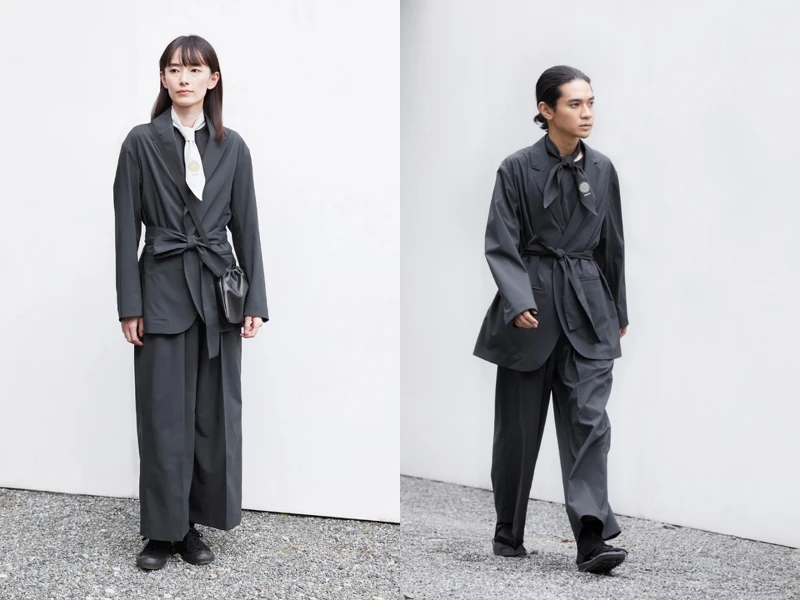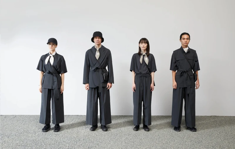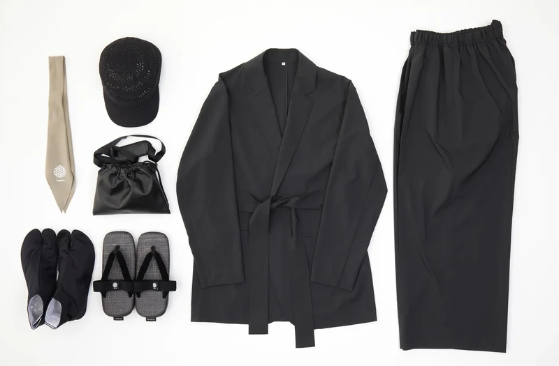設計師緊扣「循環」理念製作每一項細節,採用容易回收的單一環保材質打造服裝;木屐由傳統木屐進化, 透過日本品牌goyemon的革新創造,為木屐加入運動氣墊鞋底,以及鬆緊繫帶設計,解放員工們久站、行走的雙腳。此外,員工們可自由選擇領巾顏色,來為統一的碳黑色制服增加個人特色,所有裝備還能夠包入「風呂敷」當中,方便攜帶之餘,同時重申日本文化的精髓。