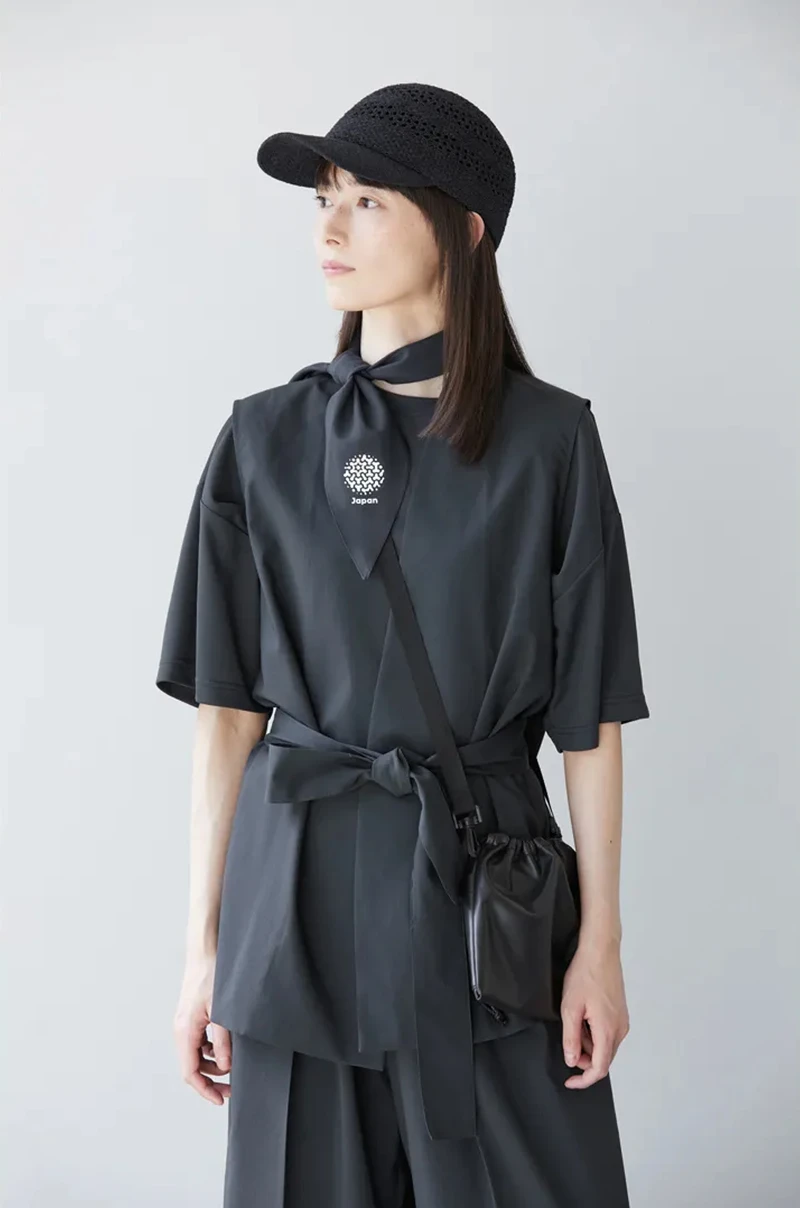 日本館制服由Postelegant創意總監中田優也(Yuya Nakata)操刀設計,以「日式の美學意識」出發,將最具日本文化代表性的傳統和服現代化,打造出一套無性別的極簡風黑色和服,制服項目包含 T-shirt、襯衫、西裝外套與長褲、隨身包、木屐、足袋和鐘形帽、鴨舌帽。