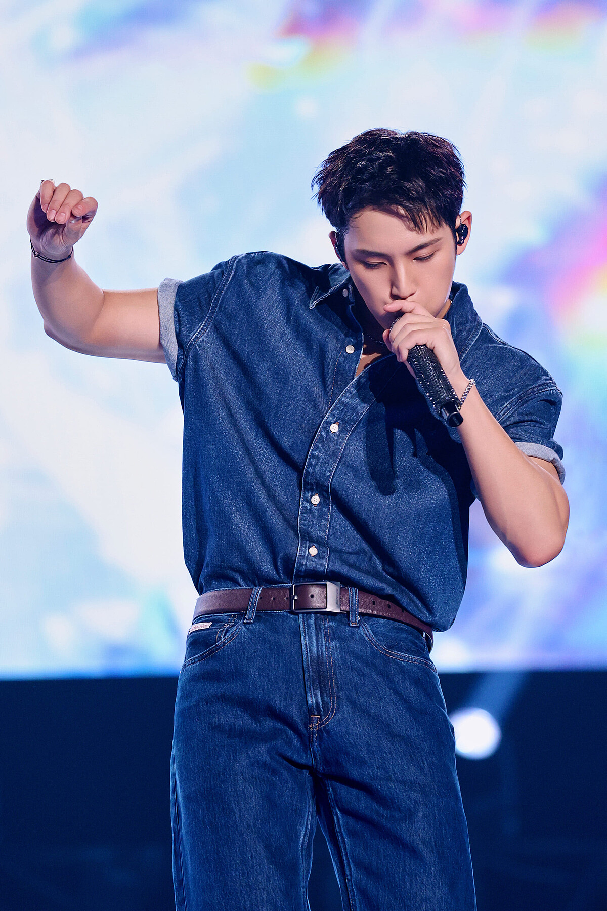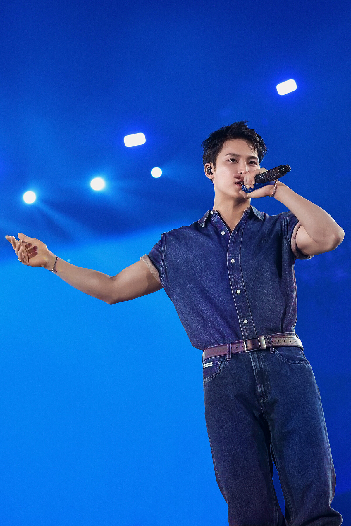 珉奎下身搭配同色 90s 直筒牛仔褲與 Calvin Klein 腰帶,展現俐落的造型輪廓,整體色調和諧又率性,彷彿現代牛仔般,摩登又充滿自信!