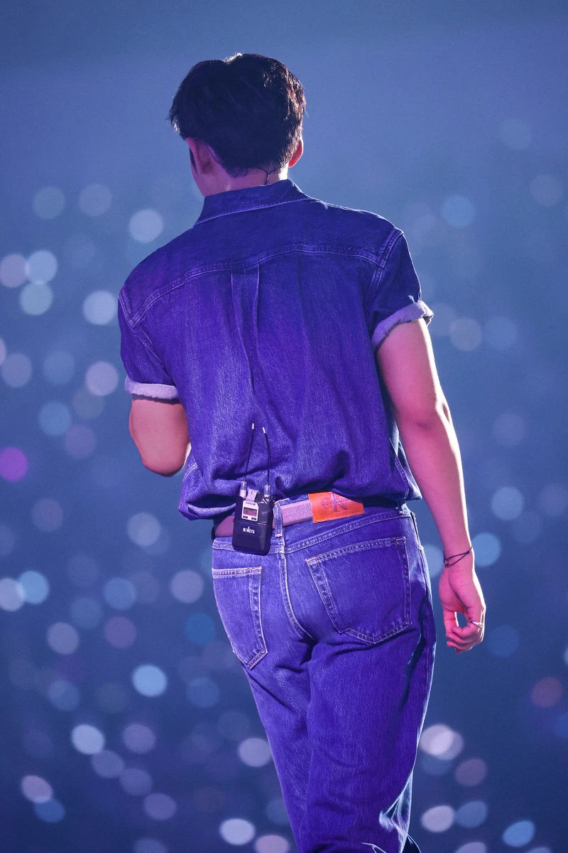 可以看見珉奎當日身穿 Calvin Klein 深藍色 Overfit 短袖丹寧襯衫露出結實手臂,大狗狗的炸裂好身材只能說是完美衣架子~