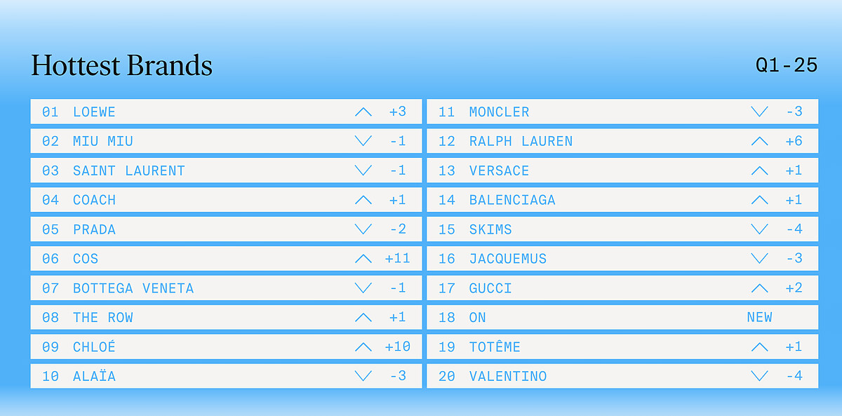 2025年第一季,全球精品產業交出了喜憂參半的銷售財報。根據各大集團公布的數據,儘管市場仍具韌性,但成長趨勢明顯趨緩。不過,在一片財務數字之外,依據搜尋引擎與社群分享話題的整理排行,仍舊顯示了消費者對於時尚熱度有所熱情,Lyst公布的最新2025 Q1熱門品牌排行榜你心儀的有幾項呢?
