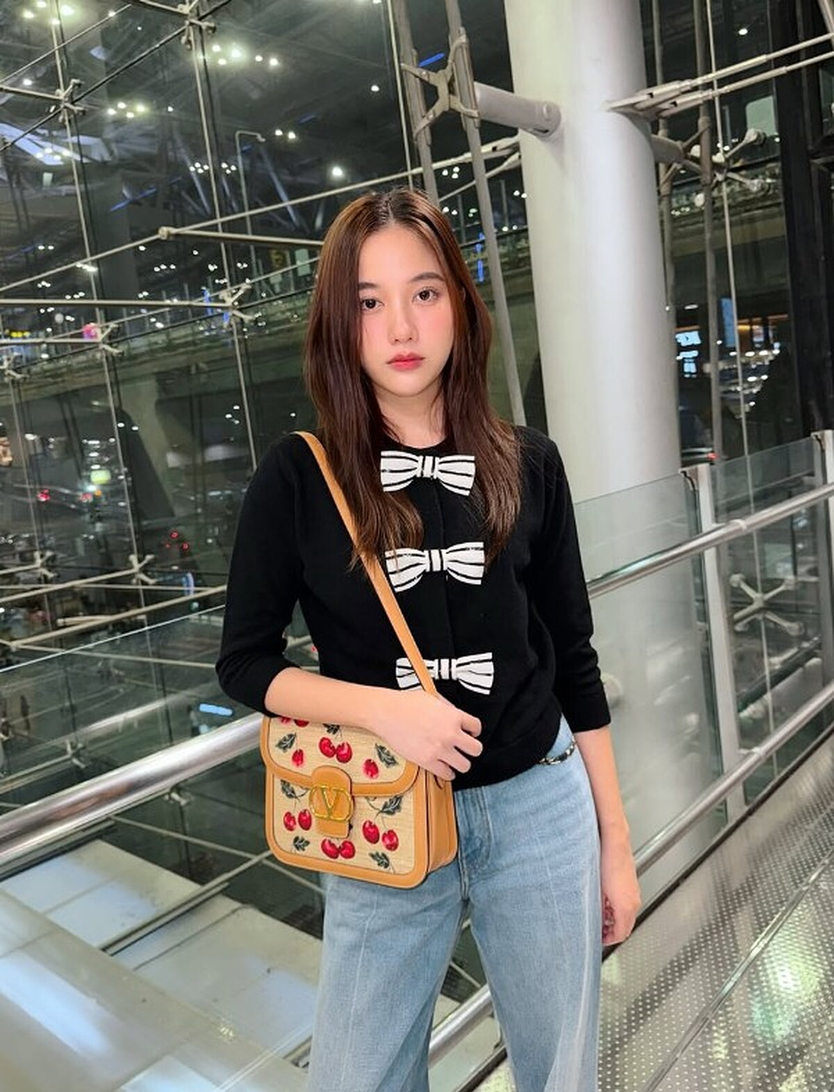 作為Valentino品牌大使,Freen無疑受到了品牌的重視與寵愛。Freen選擇2025春夏Valentino 9TO5櫻桃印花肩包,這款手袋以輕盈的托特包型為基礎,搭配俏皮的櫻桃印花元素,展現出既活潑又充滿夏日氣息的完美造型,青春可愛又無敵。