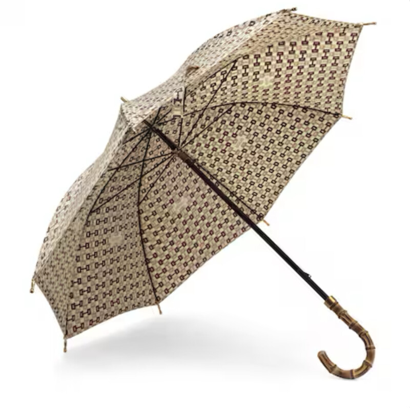 Gucci 馬銜扣印花尼龍雨傘,Gucci 推出馬銜扣印花傘,這款採用 Gucci Horsebit 印花尼龍布料,其實完全防水。而手把部分則以Gucci 起源的象徵竹子所製作,時髦迷必收吧。
