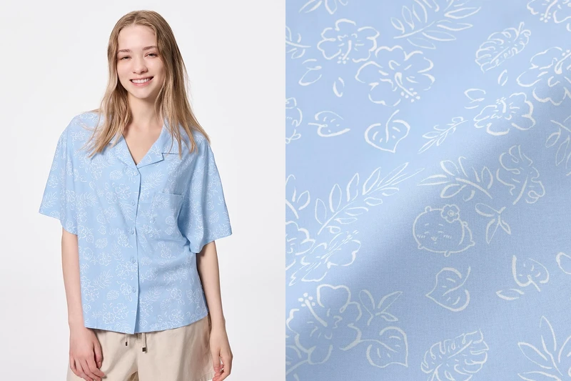 舒爽材質的夏威夷襯衫是夏日的實用單品,而滿版的印花也是夏威夷襯衫的精髓。GU x 吉伊卡哇的聯名襯衫上,於樹葉、花朵等植物飄逸灑落的花紋裡頭,可以發現吉伊卡哇藏身其中,像這樣不明顯的小細節更顯可愛!