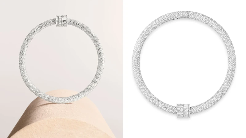系列核心作品——白金全鑽頸鍊,以細膩粒鑲鑽石鋪陳整體,將品牌標誌圖騰重構於中央,以不同切割形狀展現細節層次:矩形鑽石象徵羅緞直線刻紋、公主方形呈現巴黎飾紋、圓形鑽石織出雙圈同心圓,而純粹的鑽石圈則作為永恆象徵,貫穿整體設計語言。
