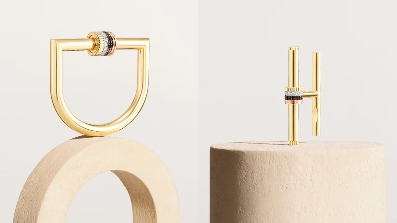 系列同步推出五款當代設計:兩款頸圈、一只手鐲、一枚戒指與一對耳環。作品皆以黃金、白金與玫瑰金三金結合棕色PVD處理,交織出Quatre系列專屬的「四重色彩語彙」。細節之中蘊藏巧思:旋轉機關、隱藏式結構與可滑動設計,讓佩戴者自在切換風格,從優雅日常至出席盛會,皆能完美駕馭。