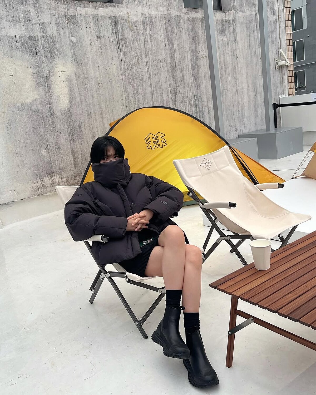 前一陣子開始流行的大立領羽絨外套,寬大厚實的廓型穿起來酷帥度十足,金泰梨在外套底下搭配針織連身短裙,不只增加俏麗氣質也避免整個人都被冬天的厚重衣物吃掉,最後以中筒靴完成帥氣的全黑穿搭。
