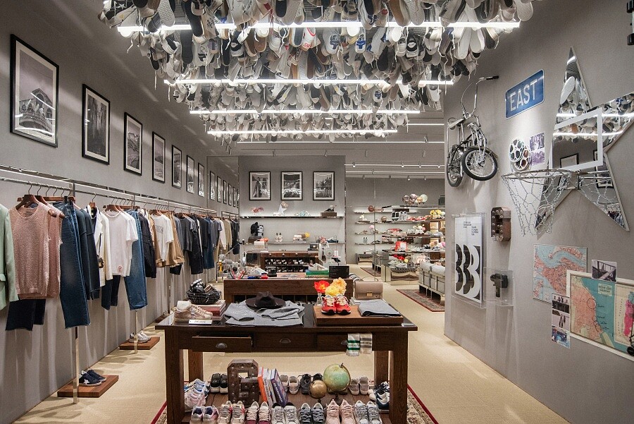 Golden Goose微風南山門市以全新風貌登場,在佔地逾 64 坪的店內注入威尼斯總部的文化底蘊,原始混凝土牆面打造出未經修飾的工業風貌,搭配來自世界各地的珍藏紀念品,地面則鋪設以義大利古董木材拼接而成的人字紋地板,搭配上復古地毯與老件木製家具則為空間注入獨特個性,踏入店內抬頭仰望,更可以看見大量Golden Goose鞋履懸吊於空中,是透過品牌早期將鞋款懸掛於陽光下曝曬,讓邊緣自然染上標誌性的仿舊黃色(Foxing)痕跡為靈感。