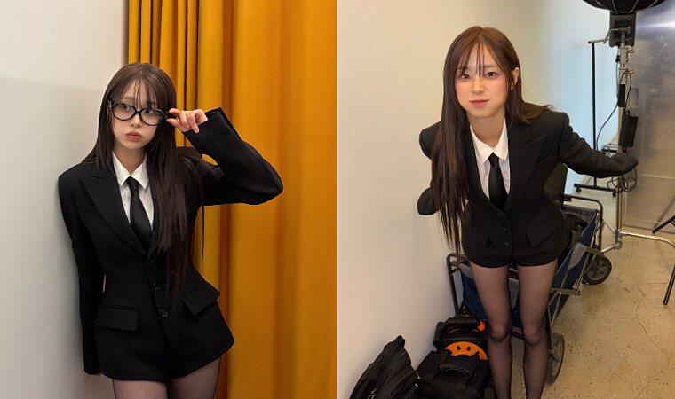誰說甜妹不能耍性感!長相幼態的CHUU選擇帶有腰身設計的西裝外套配上短褲,利用服裝剪裁修飾身形,同時也能增添氣勢,領帶和眼鏡則是可以增添高智感,整個人看起來幹練又不失親切感,反差魅力滿點。