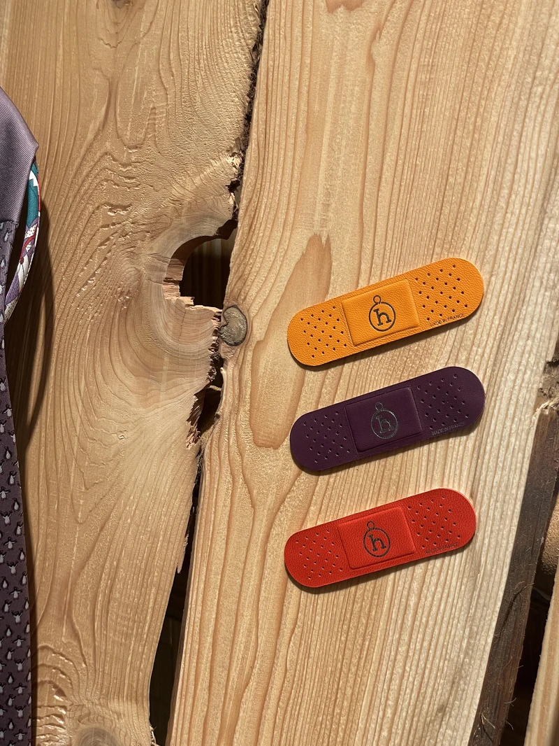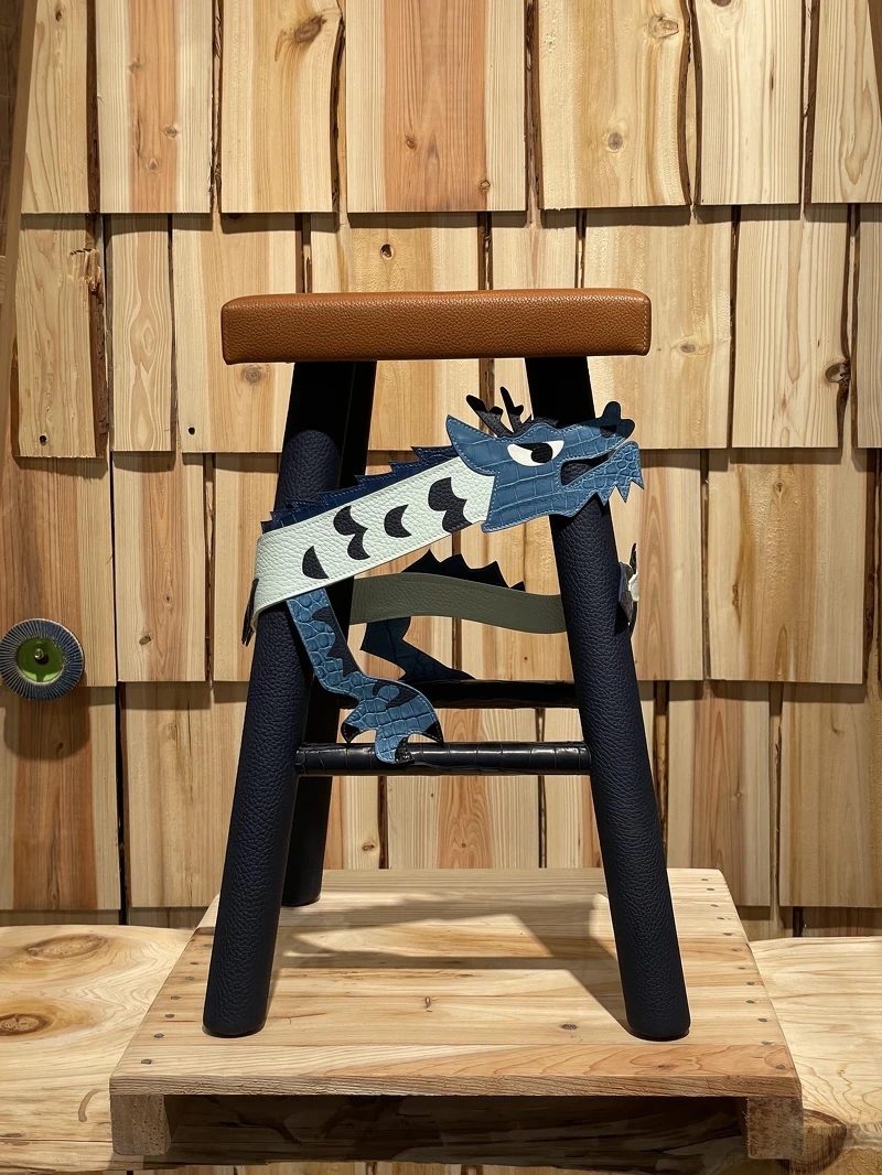 異材質拼接是petit h工坊設計手法的精髓,從皮革、真絲、水晶、陶瓷……用你意想不到的方式組合在一起。像是馬鞍、木頭與絲巾打造的搖椅,軟木、水晶與皮革打造的矮凳。有些你熟悉的愛馬仕零件,如配件上的金屬釦環、包包手提把、泳衣上的Logo、鈕扣……也作為設計元素使用,而這些作法同時相當考驗不同材質間的鑲嵌技術。