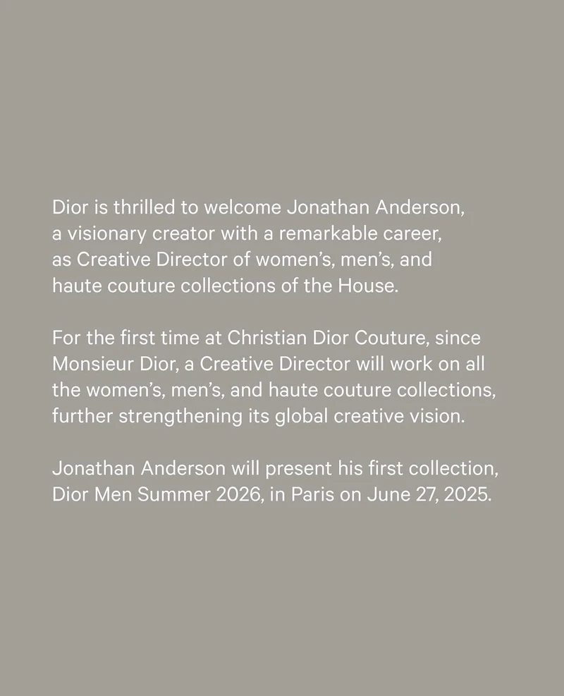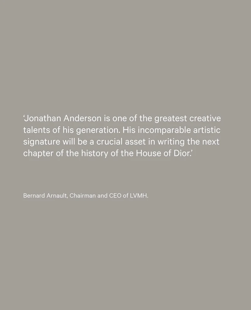 LVMH集團董事長Bernard Arnault亦補充道:「Jonathan Anderson將成為Dior跨入新篇章的關鍵資產,他那無可取代的藝術語言,正是品牌需要的創意火花。」