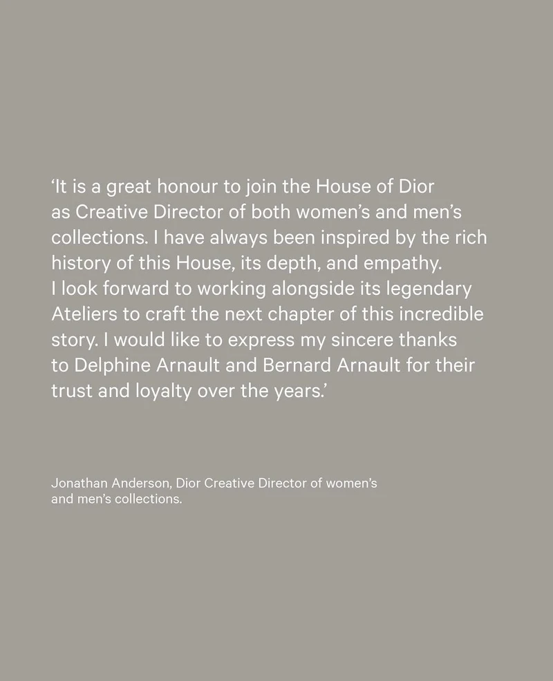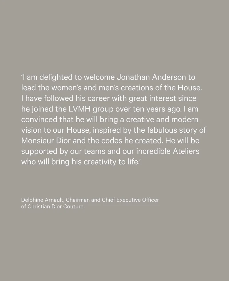現任Dior董事長暨執行長Delphine Arnault表示:「Jonathan Anderson是當代最具遠見的創作者之一,將為Dior注入當代精神與無限創意。他對工藝的熱愛、對歷史的尊重與藝術語彙的獨特性,勢必帶來耳目一新的風貌。」