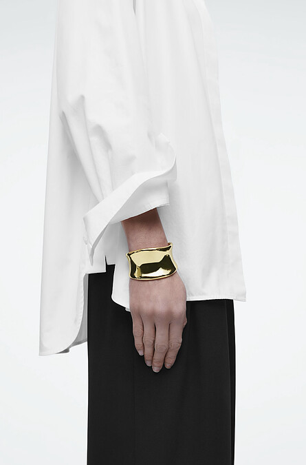 COS的飾品幾乎沒有多餘的裝飾設計。簡約大方的造型很輕易就能點醒整套穿搭,這款袖口寬版手環也是編輯喜愛的單品之一,低調卻有態度,可以陪你度過這個夏季。