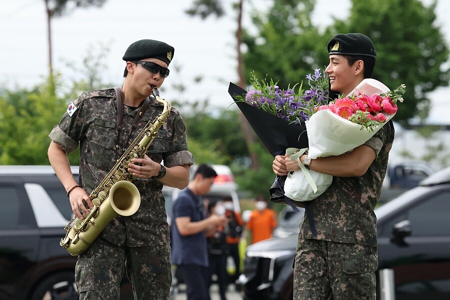與V在同一天進行退伍申告儀式的RM,在自己的退伍儀式中再次出動了薩克斯風現場吹奏自己的進場BGM,而上一次出現現場薩克斯風則是在大哥Jin退伍時,RM現場為Jin吹奏了BTS的熱門歌曲〈Dynamite〉作為退伍BGM!不知道在6月11日成員Jimin與柾國的退伍儀式上會不會也出現RM現場伴奏呢?