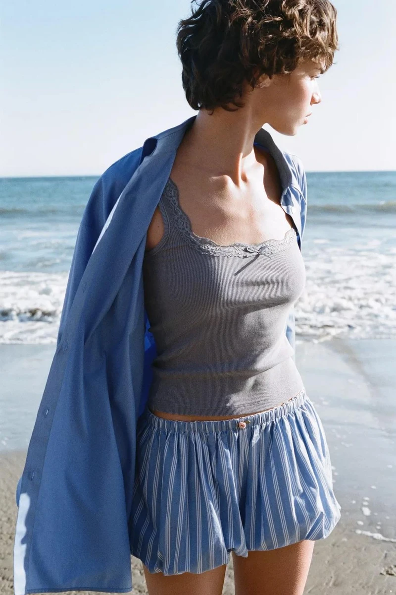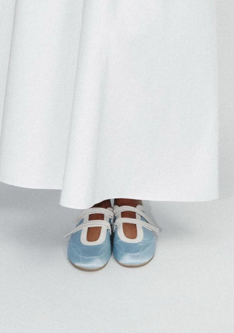 ZARA這款結合運動風的芭蕾舞平底鞋早已在社群形成話題,至今不斷推出新配色和改革版本,像這雙具有緞面光澤的鞋面,還原芭蕾舞鞋的質感,寶寶藍色則是一個適合夏日的清爽色調。