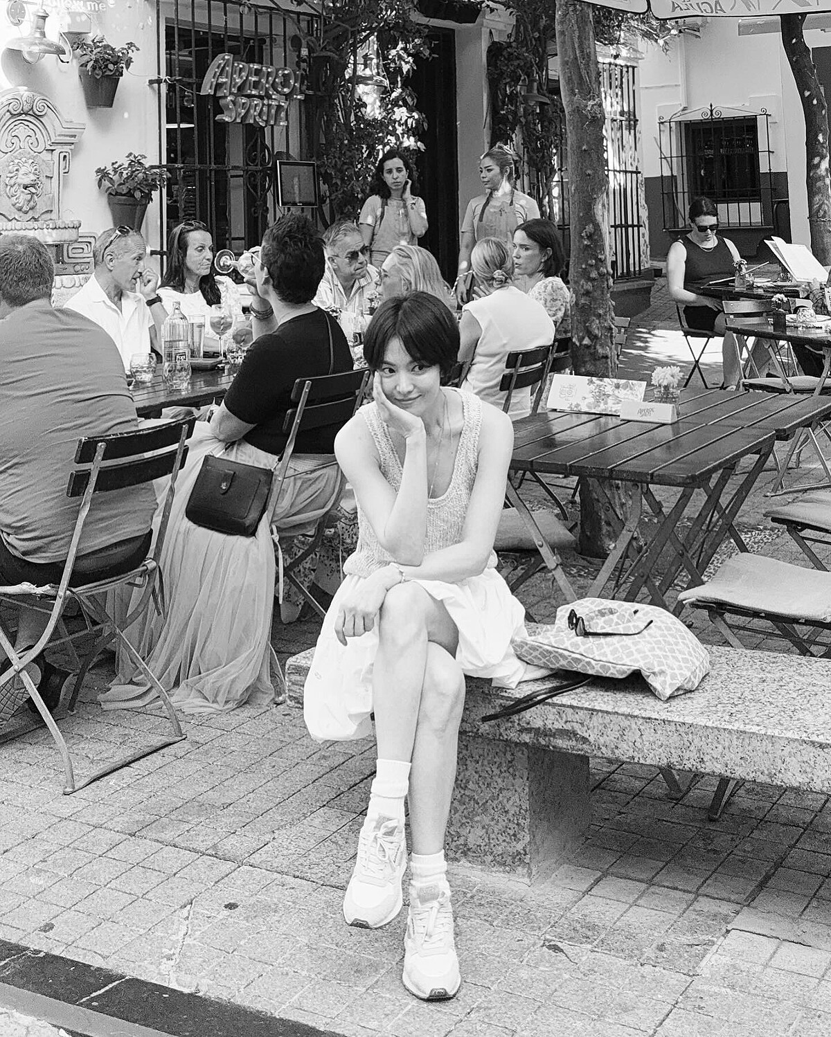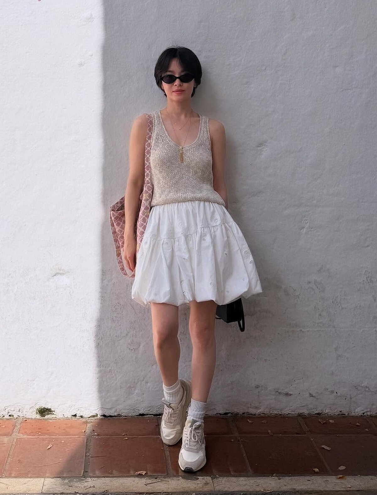 宋慧喬繼長髮白背心的造型後,換上了一套少女感十足的穿搭,以米色針織背心搭配白色澎裙以及白襪運動鞋的組合,在馬德里的艷陽之下,散發滿滿的逆齡少女風格,而這套造型中宋慧喬搭配了一個大型的印花托特包,這個包包便是來自西班牙品牌De La Mur。