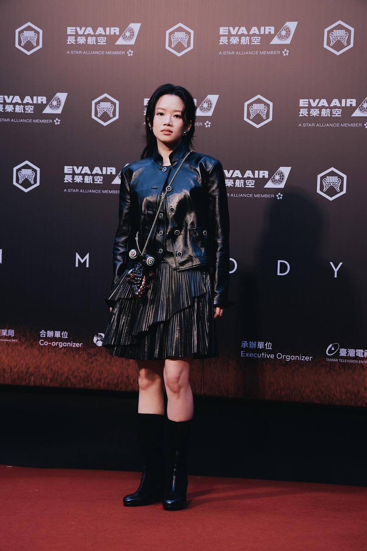 入圍最佳新人獎的Andr穿著Chanel 2024/25 Métiers d’Art工坊系列的黑色皮革外套、百褶皮裙、珠寶配件,並透過一雙西部靴為她的紅毯造型增添屬於她的俏皮與活力,專輯裡設計的怪獸胚胎則化為獨特配件。