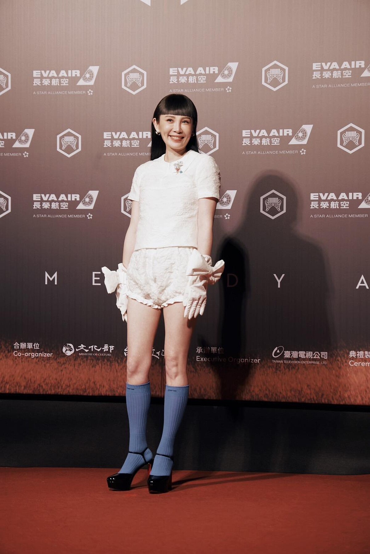魏如萱這套造型還真的只有她撐得起來!她穿著澎澎質感的上衣與花苞褲,搭配一雙大膽的藍色及膝襪與Christian Louboutin的黑色高跟鞋,還有可愛的白色蝴蝶結手套,完全就像是洋娃娃!