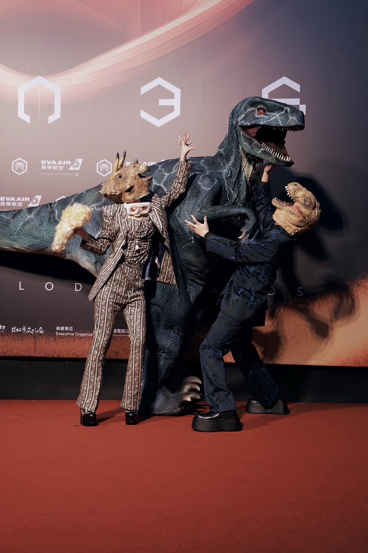 恐龍的皮在紅毯上的造型帶來不少驚喜,成員暴龍與三角龍身著正式西裝登場,三角龍以復古印花套裝展現個性,暴龍則選擇低調沉穩的深色西裝,兩人頭戴恐龍頭套,延續團體一貫的神祕風格,更驚喜帶來「遠房表弟」迅猛龍助陣。三隻恐龍一同現身,讓現場一度陷入歡笑與混亂,紅毯瞬間彷彿穿越回侏儸紀,氣氛被徹底點燃。