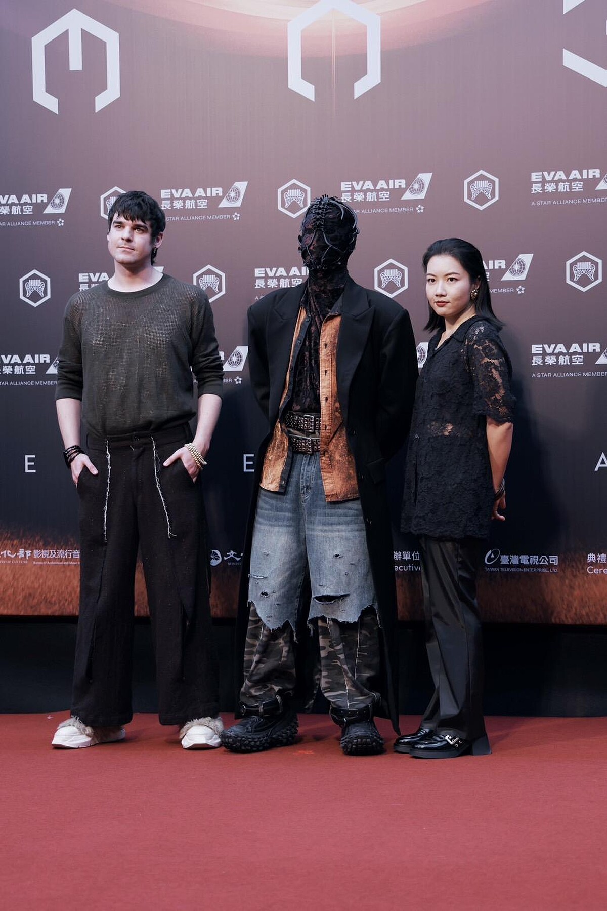 音樂人自動鮪魚以街頭感造型亮相,蒙上蕾絲頭套、搭配獨特的Y3K頭飾,以及迷彩與牛仔拼接褲,整體風格前衛神秘,帶有濃厚賽博龐克元素。這套造型不僅吸睛,連入圍歌王的FunkyMo也忍不住稱讚:「太帥了!」,獲得大家的關注。