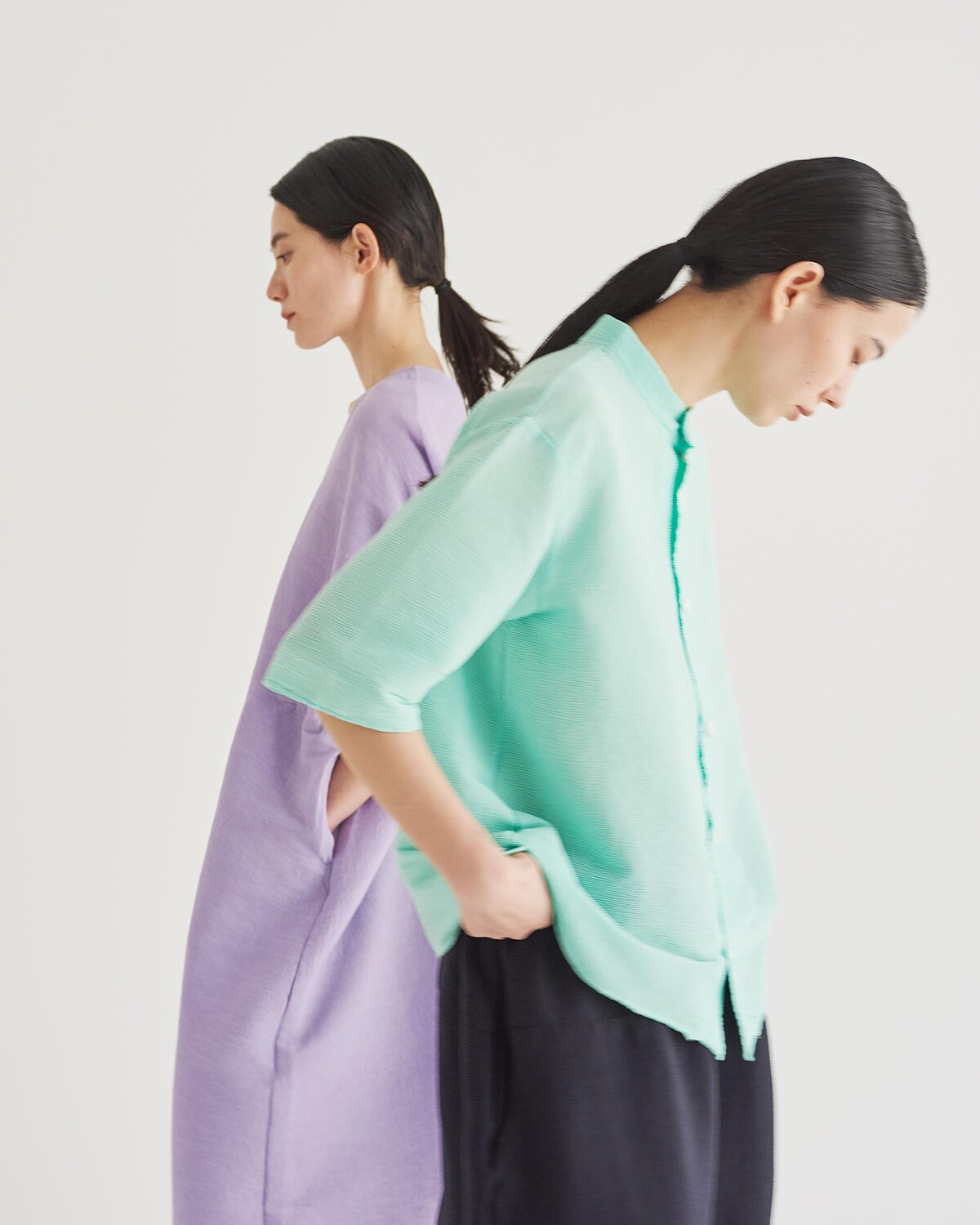 YOORYUU 布料源自日本滋賀縣高島地區的「高島縮」(Takashima Chijimi),自江戶時代以來即以輕薄透氣著稱。Plantation 將此布料橫向排列,使其呈現具彈性與節奏感的細緻褶皺,具備良好透氣性與穿著舒適度,尤其適合台灣夏季氣候。