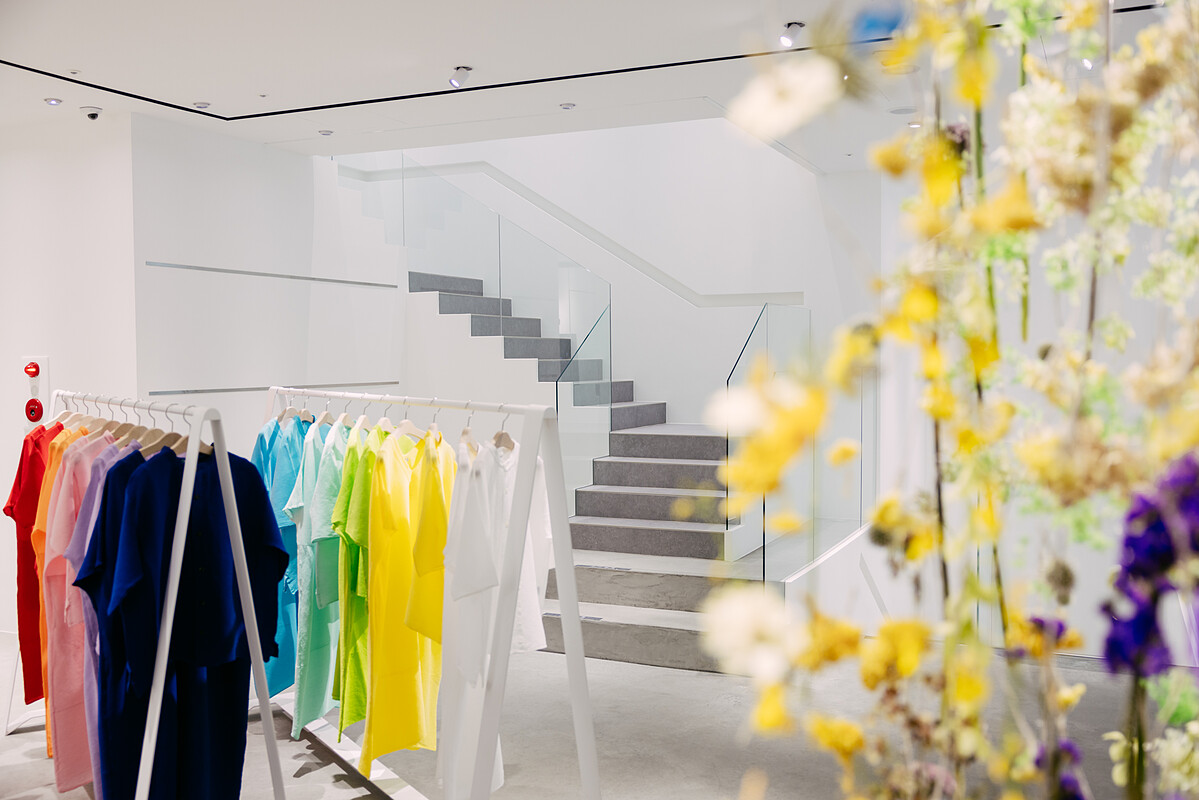 快閃現場以「色彩 × 花卉」為主軸,安排10色服飾整齊排列,搭配大型花藝裝置營造靜謐氛圍。整體空間設計介於藝廊與選品店之間,讓參觀者可在輕鬆氛圍中探索材質、色彩與穿搭之間的關係。
