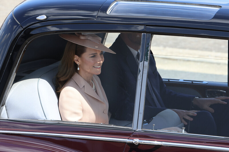 在白金漢宮舉行的歡迎儀式上,凱特王妃身穿一套來自Dior 的裸粉色套裝裙,這是由前創意總監Maria Grazia Chiuri所設計的經典「Bar Jacket」系列,靈感源自品牌創辦人Christian Dior於1947年推出的「New Look」,以其展現女性柔美與雕塑感曲線而聞。
