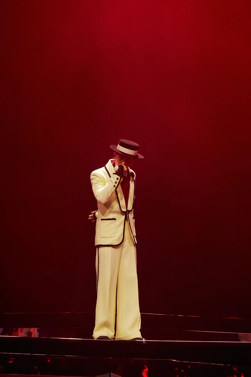 這一次,他穿上特別訂製的白色羊毛西裝套裝,俐落剪裁勾勒出摩登線條,外套更以黑色水晶刺繡滾邊低調閃耀,舞台燈光一打,整個人宛如自帶spotlight。內搭的 酒紅絲質襯衫則巧妙注入張力,既優雅又帶著叛逆氣息,完美詮釋他舞台王者的姿態。